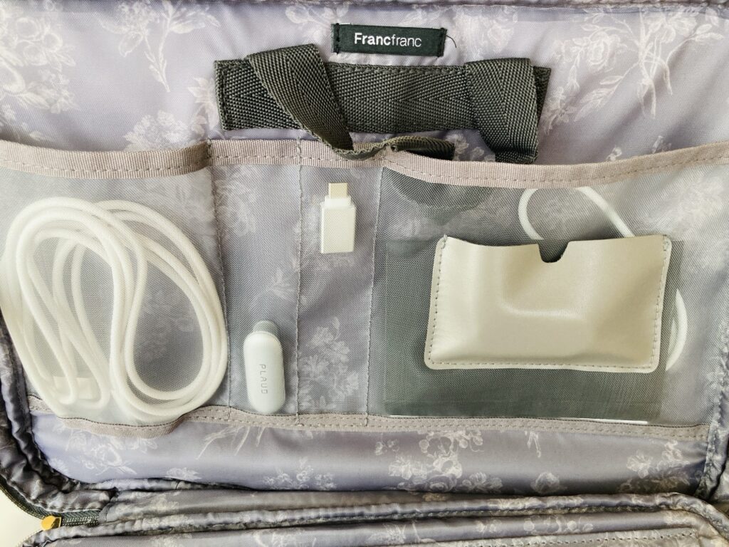 内側には収納ポケットが付いていて、充電ケーブルやイヤフォン、USBメモリなどの小物をすっきりまとめて入れられます。
