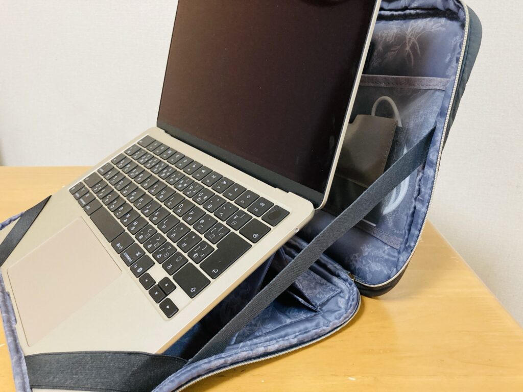 このPCケースは自宅でのデスクワークだけでなく、通勤や外出先でも大活躍。外でお仕事する日は、そのままバッグインバッグとしてリュックに入れています。ケース自体が軽いので、持ち運びの負担もほとんどありません。